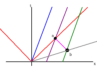 Line \(\v{ab}\) denotes the light signal between purple and green. Notice that the \(\v{ab}\) is sent out such that it is perpendicular to the light ray and point \(b\) occurs above what the stationary observer calls \(t=0\), we’ll denote this time as \(t' = 0\).