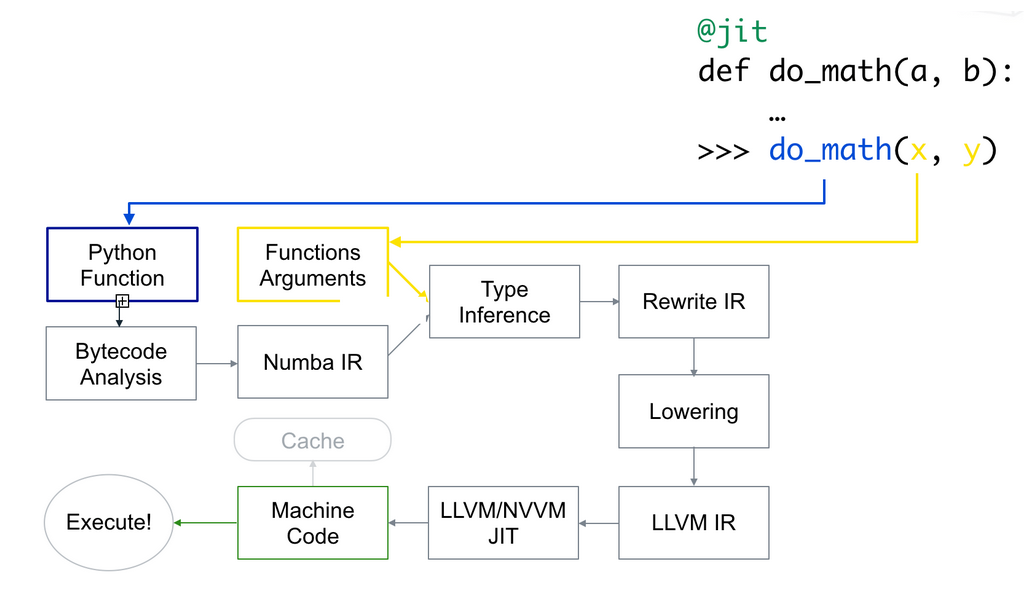 When you add the @jit decorator, Numba analyzes the Python bytecode and translates it to Numba IR (think of this as Numba’s own bytecode) which is “lowered” to a low-level, machine specific language using the LLVM compiler (think Assembly). Then by passing cache=True, this is also True by default, you can instruct Numba to write the resulting compilation into a cache, which avoids compilation time on the next run.