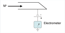 Faraday cups are charge particle detectors are typically used to tune ion beams. In the figure above, ions enters the Faraday cup, a current \(I\) is induced as ions neutralize on the metal cup. By measuring this charge \(I\), the number of charges carried by the ions in vaccuum can be calculated as: