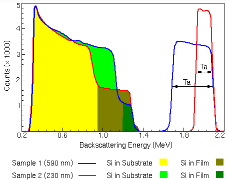 The trailing edge of the energy peaks corresponds to scattering at the interface of the Ta. The 230 nm layer film has an energy of ~1.9 MeV while the 590 nm layer has an energy of ~1.5 MeV.